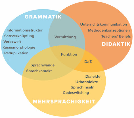 Grammatiktheoretische und formale Ansätze verbinden wir mit soziolinguistischen Perspektiven und Theorien, welche besonders die Bereiche soziale Indexikalität sowie language attitudes und beliefs in Bezug auf Varietäten des Deutschen, Variation, linguistische Repertoires und Mehrsprachigkeit erfassen.