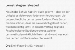 o   Di., 09.09.2025, 15:00 - 16:00 Uhr, EF50/ HS1 - Lernen lernen - Lernstrategien reloaded